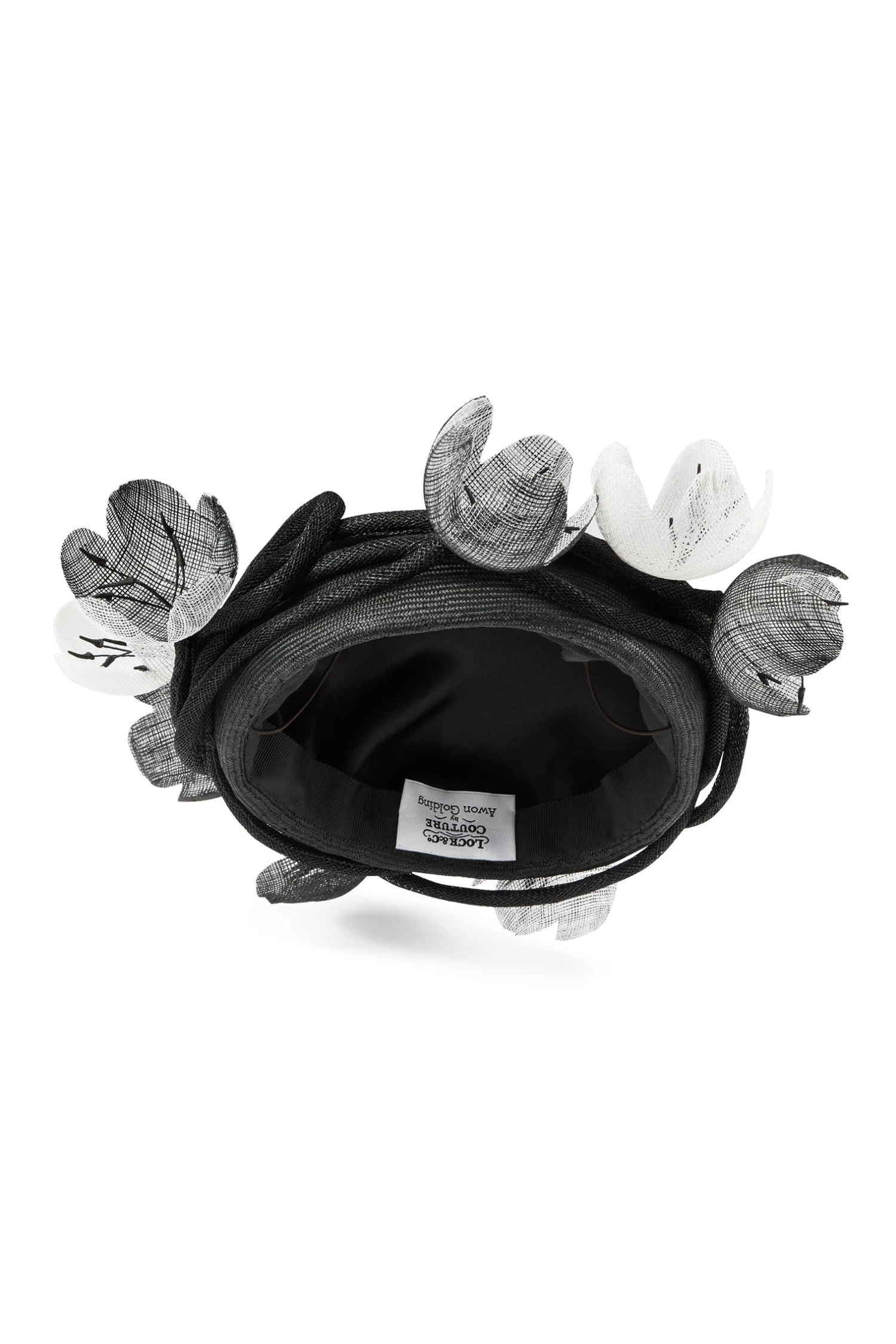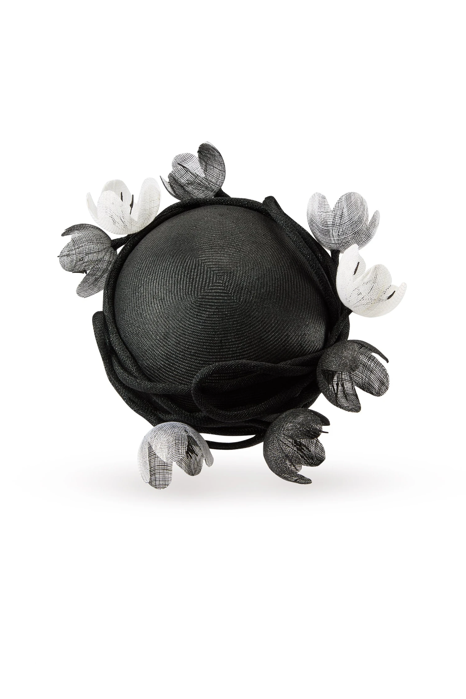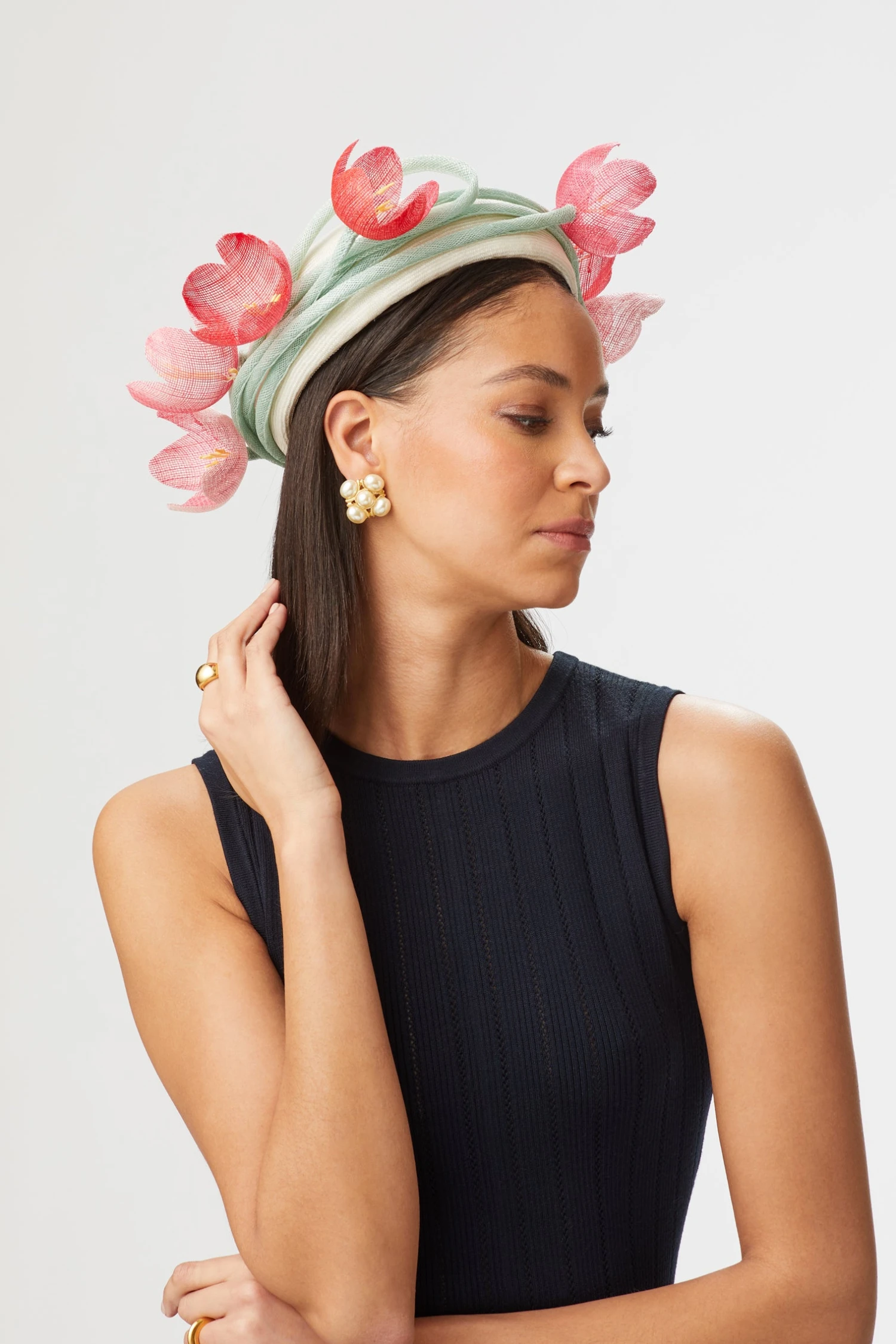 The Brita pillbox is a modern take on the classic pillbox shape made famous by Jackie O. The paribuntal straw pillbox features handmade sinamay tulips and stems.