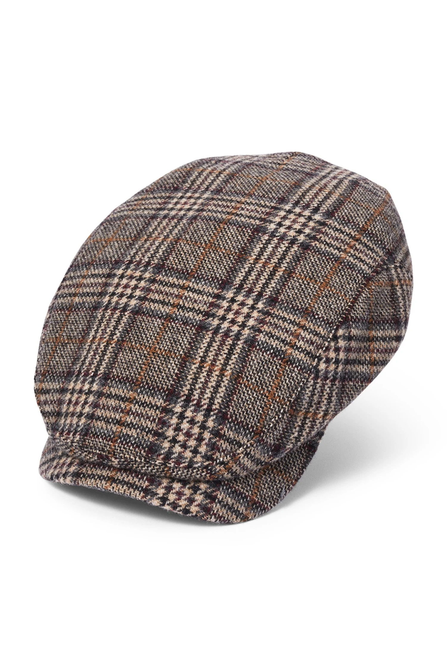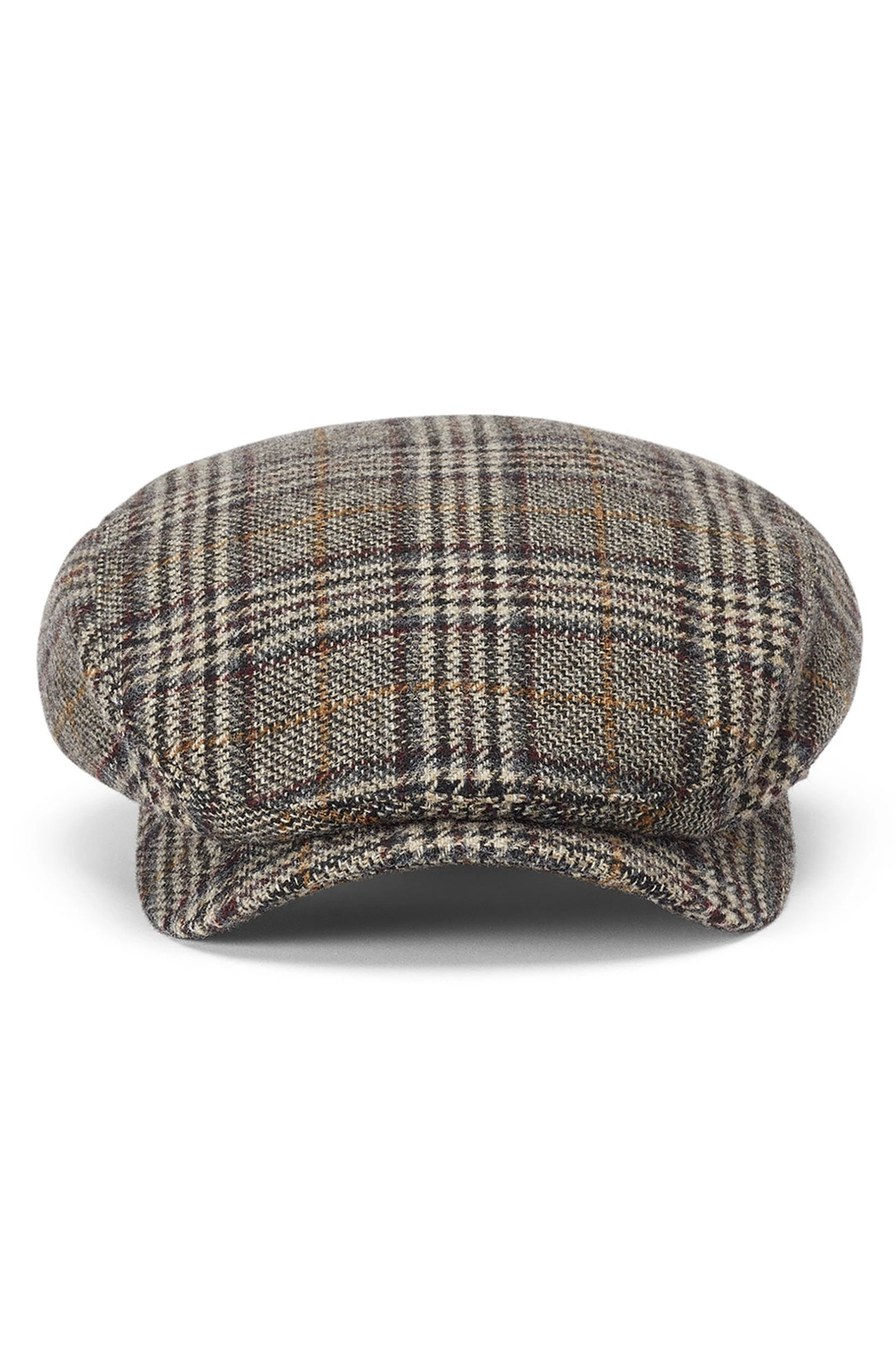 Our Lynton grey check flat cap is 100% wool and has a curved peak.
