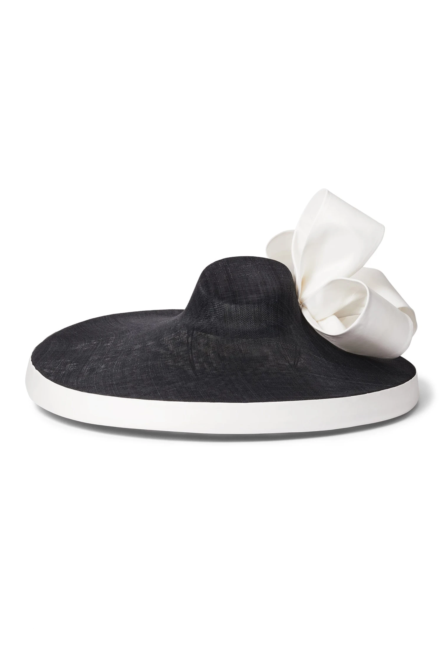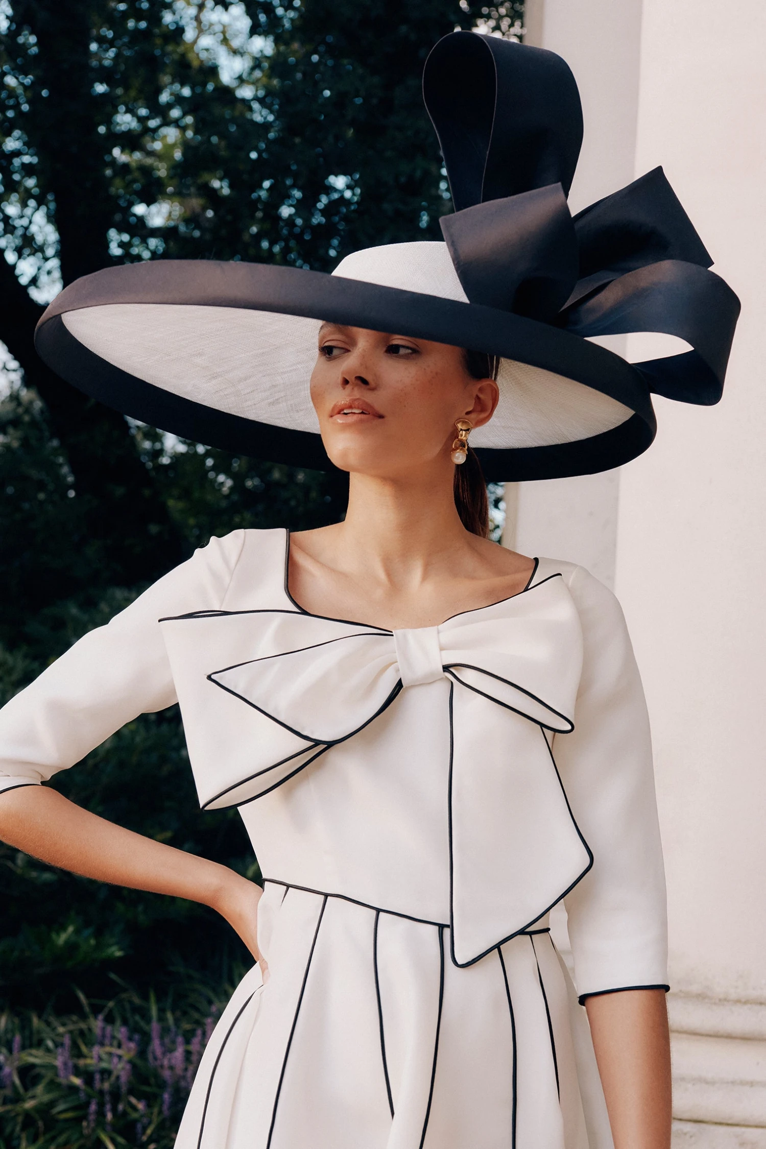 This oversized statement sinamay picture hat in black and white is one of our luxurious couture occasion hats.