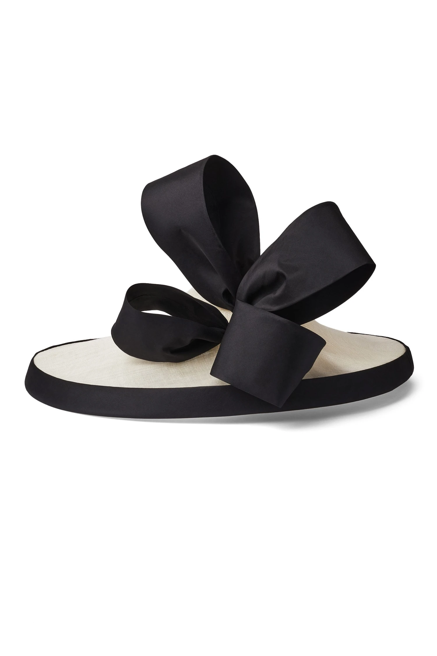 Mirage is crafted with an asymmetric crown and an elaborate silk bow with a silk taffeta brim-edge trim.