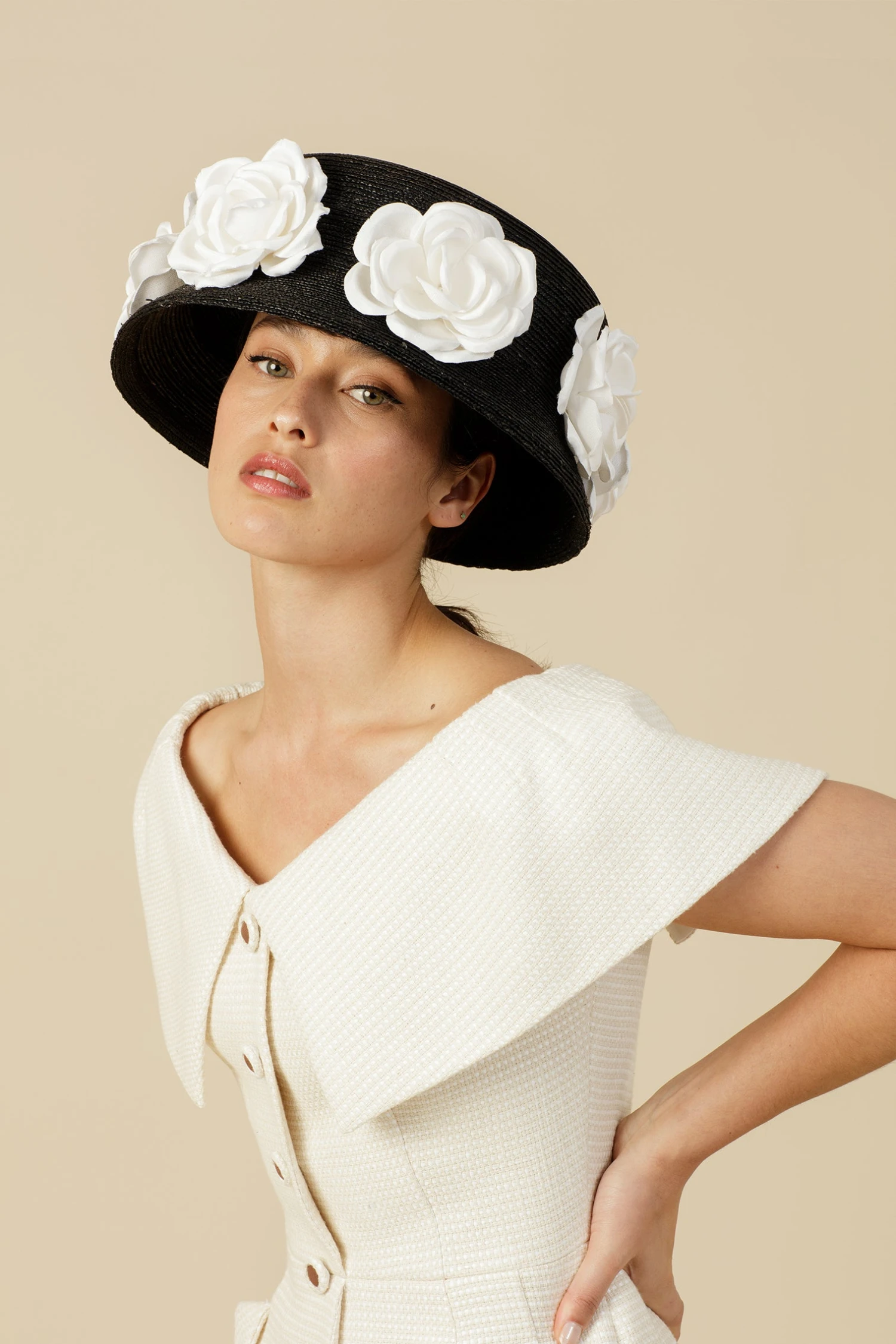 An oversized straw braid hat that features handmade white silk flowers. Pair this with a figure-grazing pencil dress or tea dress to complete the look.