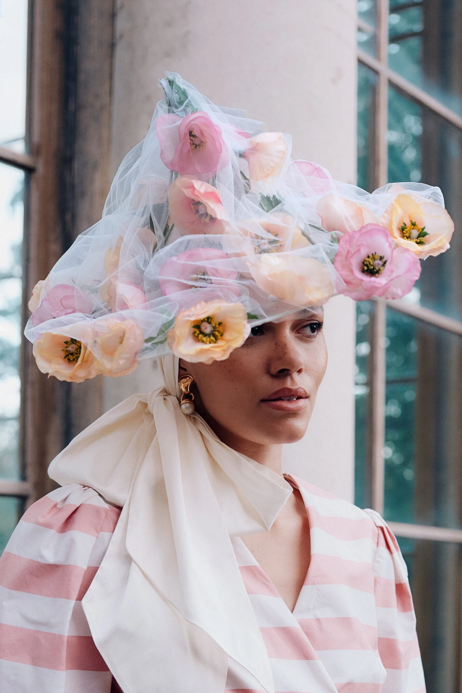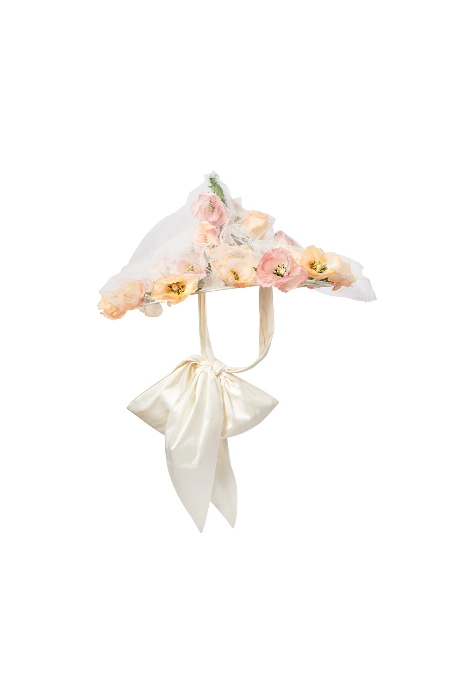 Oasis is a unique one-off piece; a luxurious couture tulle-draped wire frame conical-shaped hat covered with rare vintage poppies, and featuring oversized dupion silk under-chin ties.