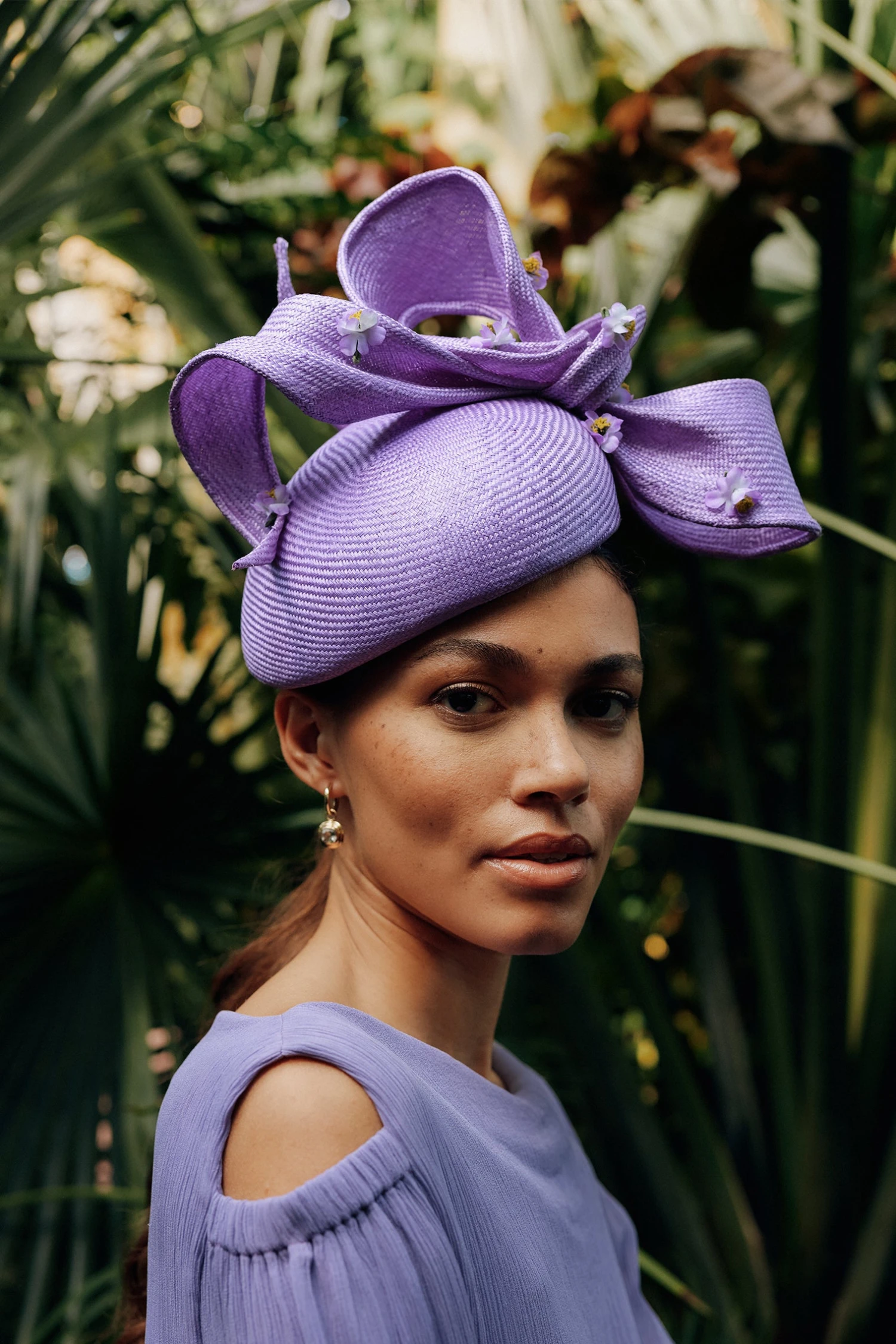 Available in purple, ivory, and pink and crafted from parasisal straw with a hand-shaped bow and mini vintage flower detailing.