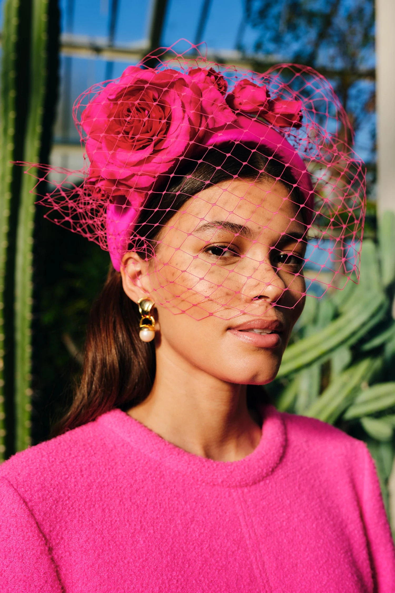 A luxuriously crafted Dupion silk covered blocked headband with matching handmade silk rose spray and draped veiling is available in pink, blue, and silver