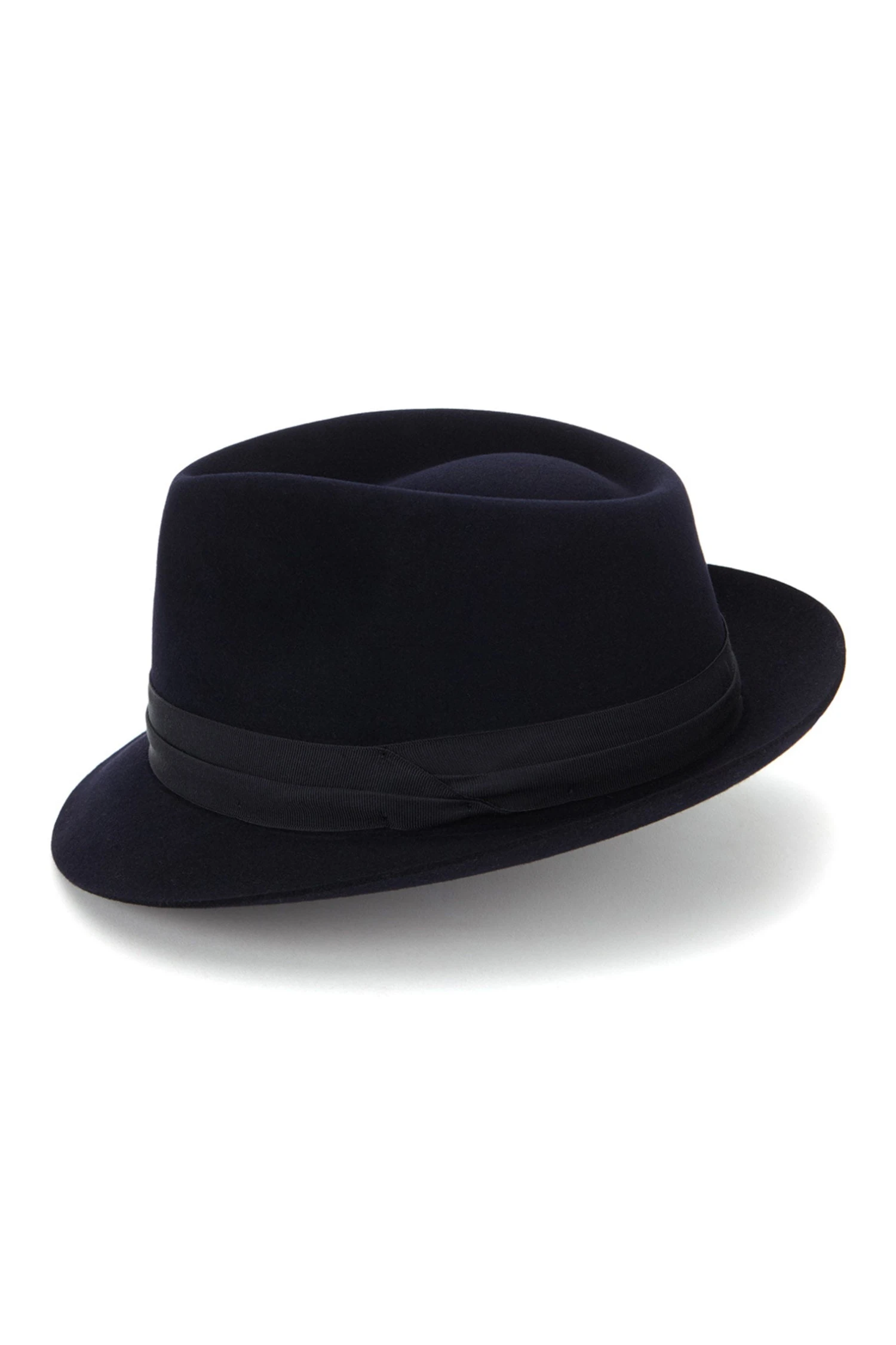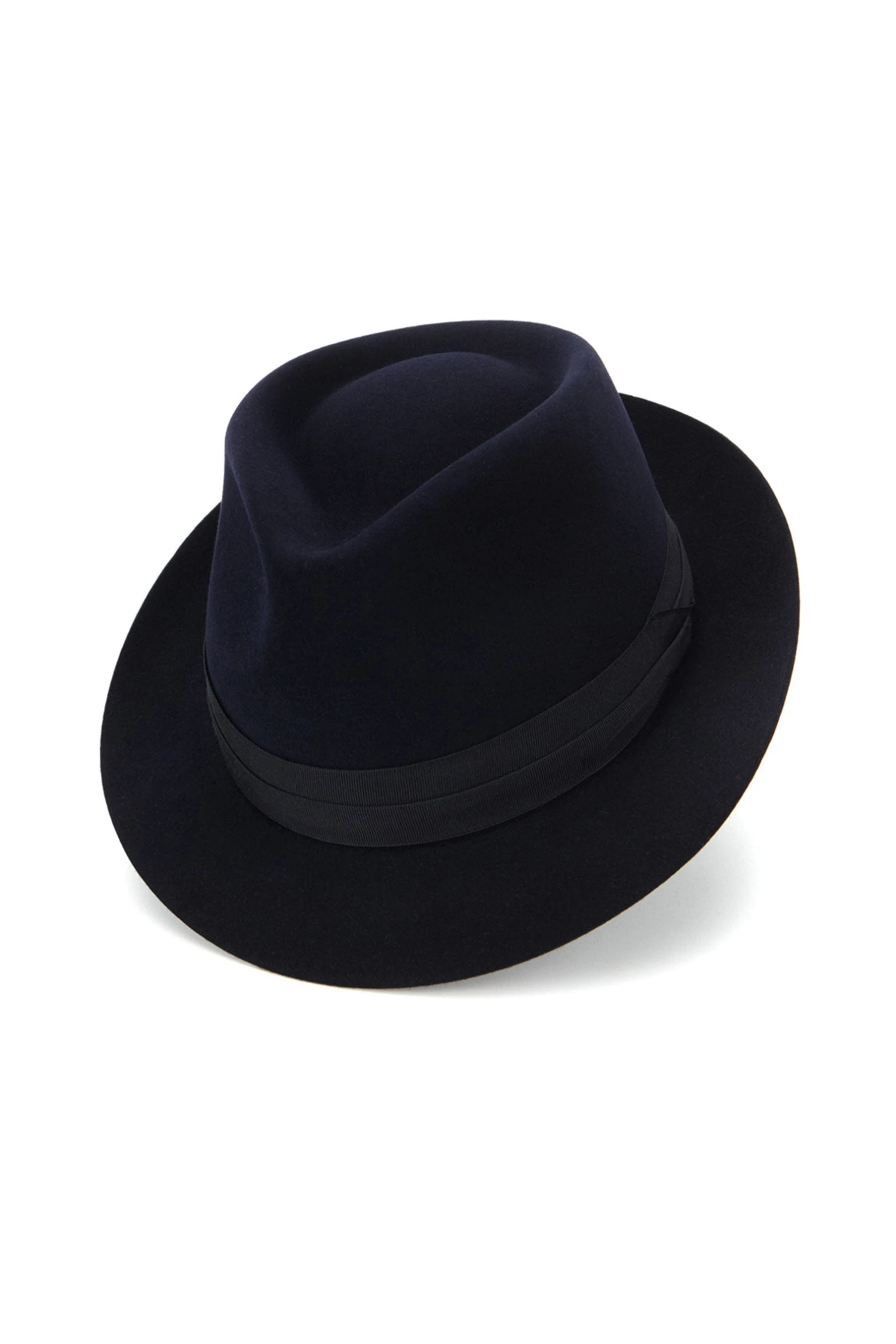The dashing Telstar navy trilby, with its distinctive teardrop-shaped, sloped crown, is perfect for the man about town who prefers a narrower style snap brim.