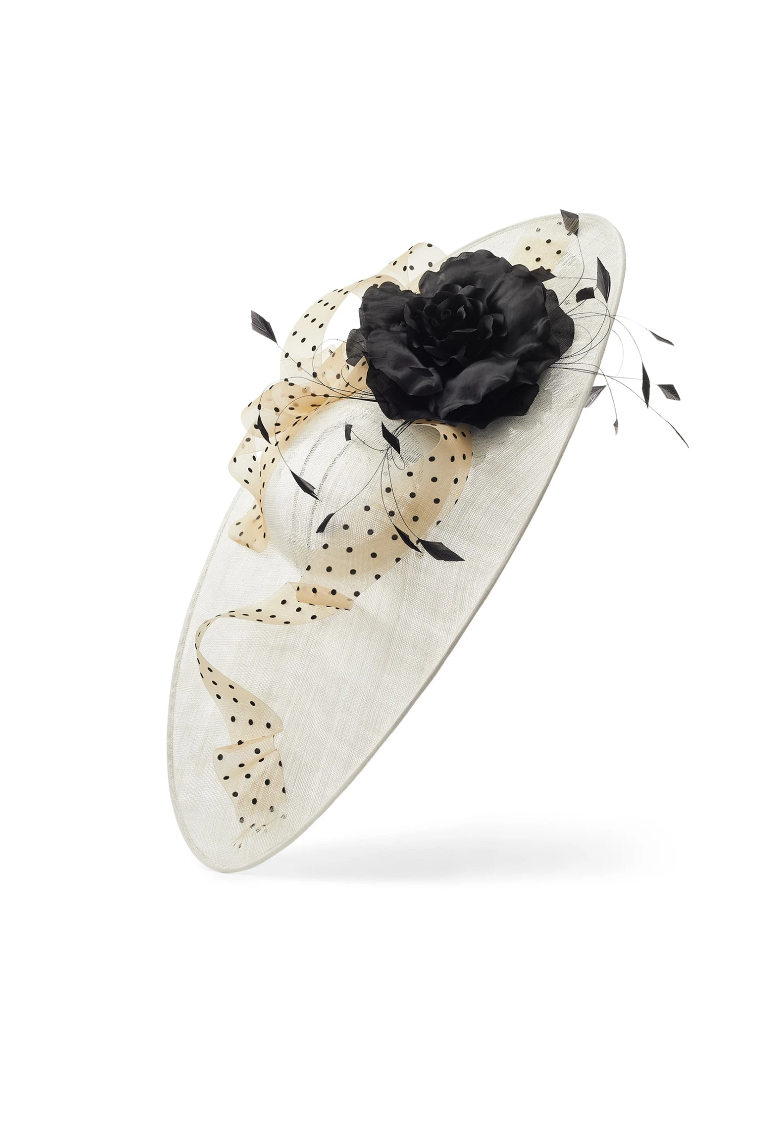 Guaranteed to turn heads with its unparalleled elegance and crafted with meticulous attention to detail, this oversized slice hat features a distinctive almond-shaped wide brim base, setting the stage for effortless glamour. Adorned with two giant silk roses atop and beneath the brim, this hat exudes timeless femininity and grace. Whether you’re gracing the Royal Enclosure at Ascot or attending a special event, this hat promises to captivate attention and elevate your ensemble with its exquisite design and craftsmanship. Embrace the essence of sophistication and make a lasting impression with this key Ascot look.